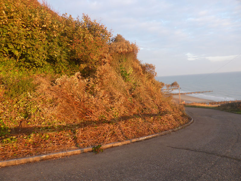 With low tides, first thing, this week we’ve been able to walk along the promenade (dipping down onto the beach where the slumps are and the closure is located) while watching the sun rising. We noticed, the much awaited work on the slumps and the cliffs has commenced. First, we saw a pipe has been located up the cliff and down to the sea wall, (see photo below) which I presume is draining excess water out of the cliffs and then today we could see part of the cliff to the west of the pipe has been scraped away. This particular area of the cliffs has so far been free from knotweed. The contractors have deposited the material they’ve removed, down at the east end of the promenade, behind the revetments. Here, over a period of time and high tides, it will most likely get washed away. Since writing this blog, I have found a link, on NNDC’s Facebook page which provides details of their plans and timeframes for implementing the clearance of the slump and dealing with the knotweed. Click here to access the document.